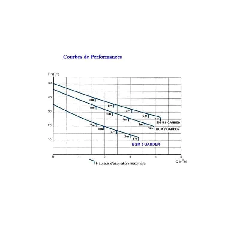 Pression de service maximale : 8 bar – Hauteur maximale d’aspiration : 7 mètres.
